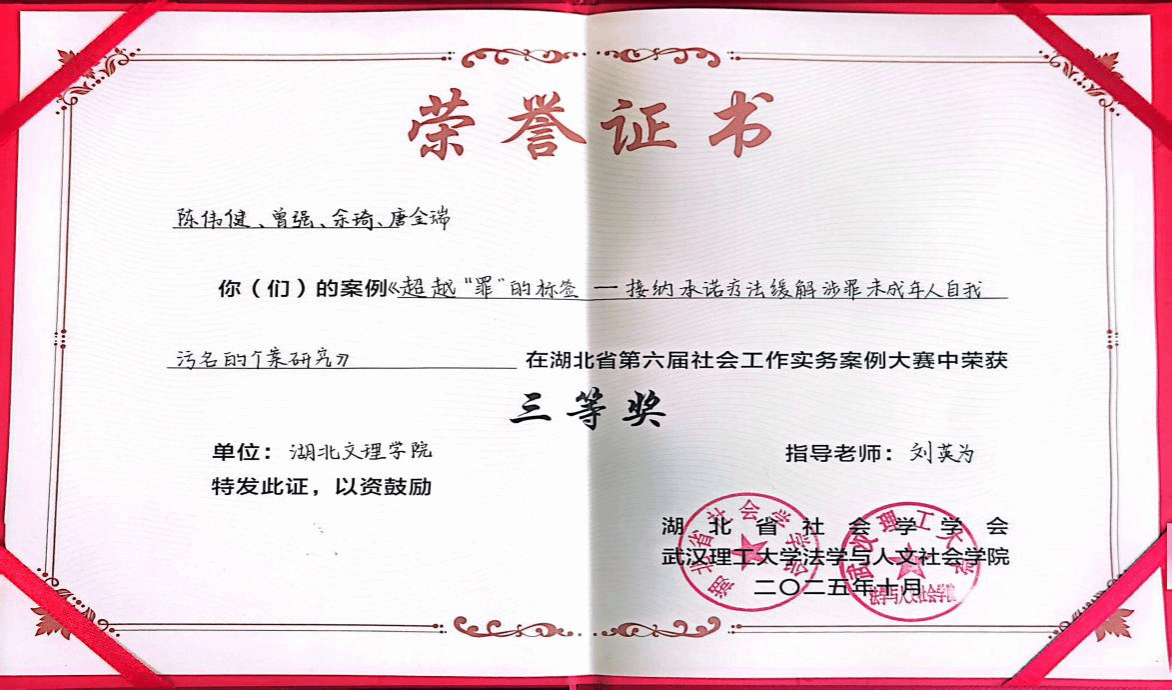 (政法学院 通讯员 唐金瑞)2025年10月26日,我校政法学院社会工作研究生团队以《超越“罪”的标签——接纳承诺疗法缓解涉罪未成年人自我污名的个案研究》(团队成员:陈伟健、曾强、余琦、唐金瑞;指导教师:刘英为)在湖北省第六届社会工作实务案例大赛中获得三等奖。
